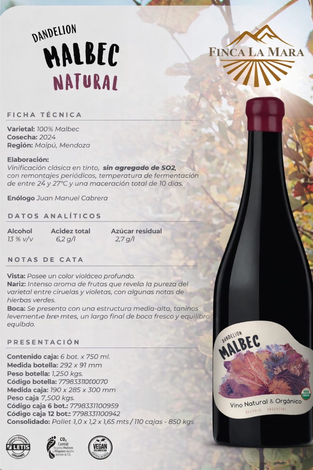 DANDELION NATURAL MALBEC -Las compras son por caja de 6 unidades – Combinalos como quieras-